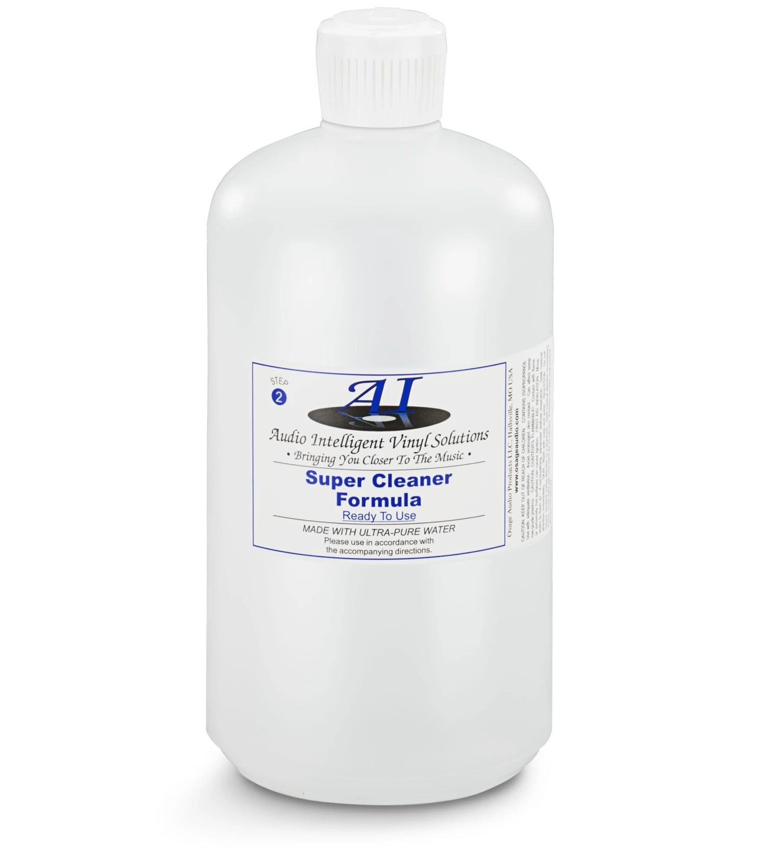 Step Two: The Audio Intelligent Vinyl Solution Super Cleaner Formula is intended for use after the Enzymatic Formula as the second step in the record cleaning process. The Super Cleaner Formula also works on the principles of enzyme cleaning, but targets different contaminants than the Enzymatic Formula. Separating cleaning functions between two formulas allows each formula to perform its specific task more efficiently. As with the Enzymatic Formula, allowing the enzyme components to loosen and dissolve the contaminants on the record if the most effective method for cleaning. There is no need for hard scrubbing, as the fluids do the work on their own. This formula contains a very small amount of Isopropanol which aids a specific enzyme component in the formula in performing its duty. There is absolutely no detrimental effect of this amount of alcohol but if you prefer a 2nd step without any alcohol, there is also the Premium Archivist Formula without the alcohol to use as the second step.
