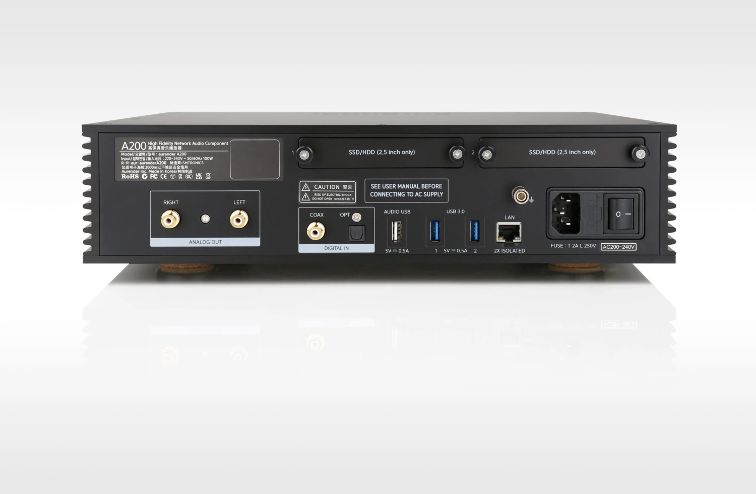 The A200 provides two user-accessible ports on its rear panel, allowing you to install the type and capacity of hard drive that best meets your requirements. Most users opt for SSDs, which are reliable, cost effective, and available in 1TB, 2TB, 4TB, and 8TB capacity. With the dual trays, it’s possible to fit the A200 with up to a mindboggling 16TB of SSD storage. If you’re a streaming enthusiast, then no drive(s) need to be fitted. But should your situation ever change, you can install them at a later date and begin to collect and store high-resolution, file-based content.