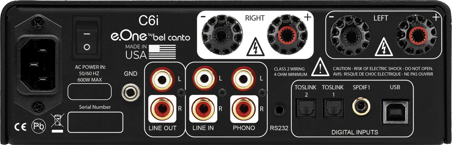 The Bel Canto e.One C6i integrated amplifier follows the highly successful e.One C5i, offering more power, a complete analog signal path, and dedicated digital inputs with up to DSD128 decoding. It is designed with a high-quality internal moving-magnet (MM) analog phono stage and USB2.0, along with S/PIDF and TOS inputs that complete a full range of source management. Plus, there is a dedicated headphone amplifier and output. Featuring 125 watts of power per channel, the C6i is capable of driving practically any loudspeakers with authority. With preamplifier and DAC functionality, as well as a powerful amp, this all-in-one component takes the work out of getting great sound.