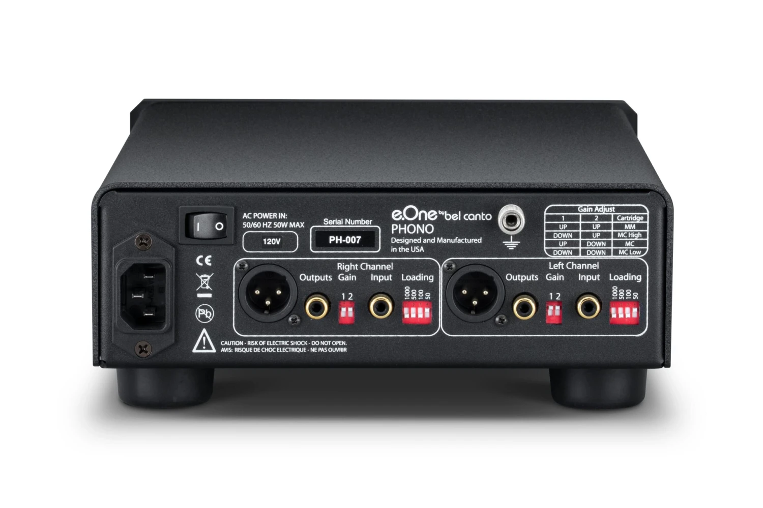 Compatible with a wide array of both MM and MC cartridges, the U.S.A.-made e.One Phono features adjustable dip switches for both gain and resistance – letting you easily dial-in the settings to exactly match the needs of your cartridge. A multi-stage channel-independent power supply, high-drive output buffer, custom output stage, and low-noise 40dB input stage further account for the warm, balanced, and immersive fidelity. A precision RIAA network further attests to the lengths to which e.One Phono goes to get analog right. And its super-compact dimensions (8.5 x 3.5 x 12 inches, WHD) and simple, elegant looks explain why this sonically focused instrument can fit practically anywhere and blend in with any decor. 100% Music Direct Guaranteed.
