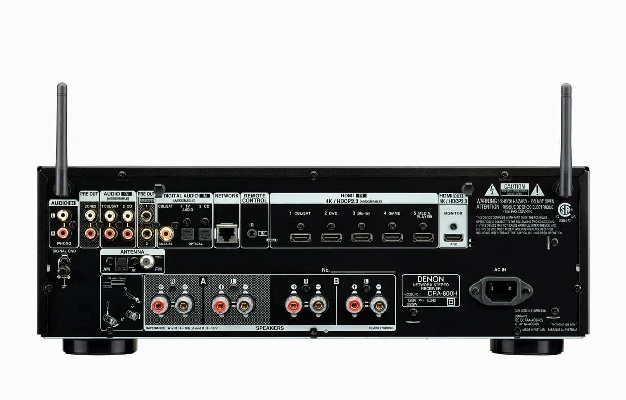 Plus, with five 4K Ultra HD HDMI inputs, ARC, and several wireless music-streaming technologies (Wi-Fi, AirPlay 2, Bluetooth, and HEOS built in), the DRA-800H can integrate seamlessly with your turntable, TV, game consoles, and CD player, as well as wireless music and Hi-Fi setups. Finding this variety of diverse connectivity and abilities, with this level of sonic and video quality β all at a reasonable price point β is rare, indeed.