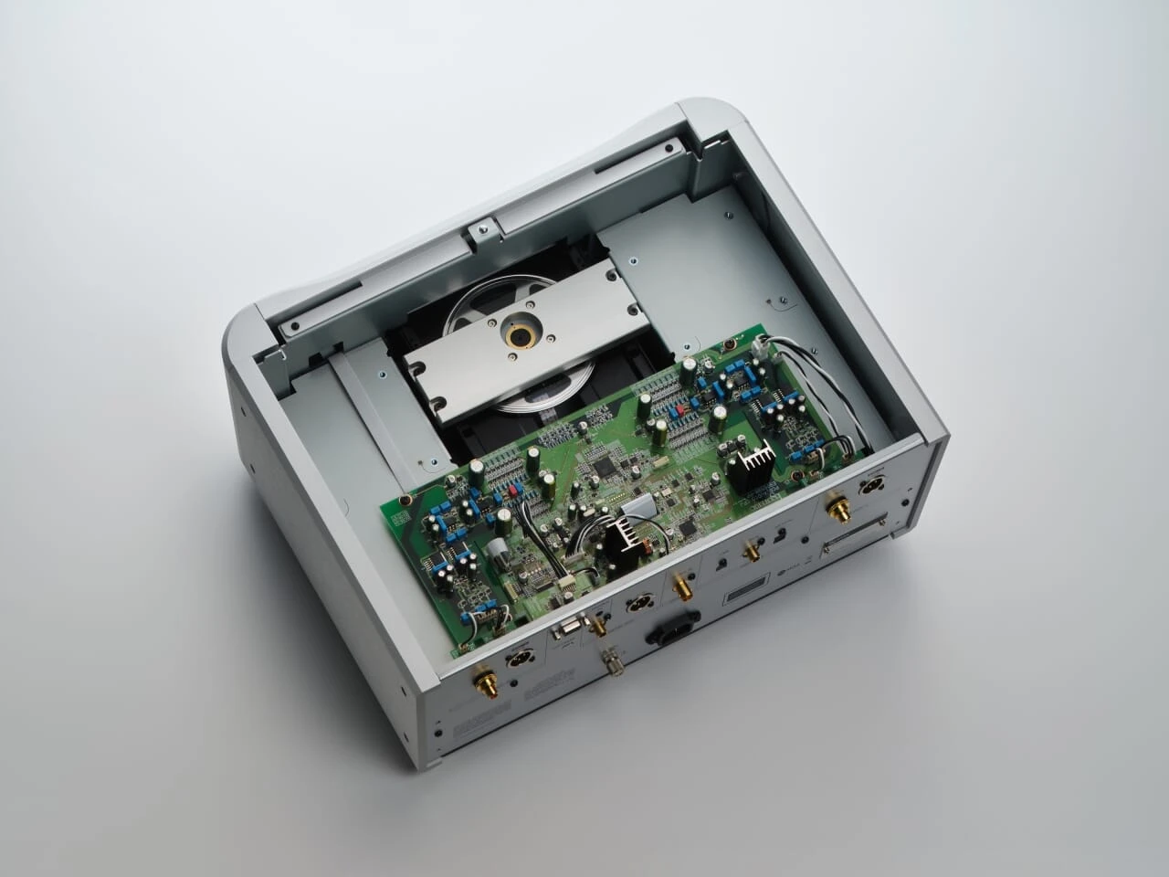 A dual-layer large chassis is employed instead of the previous K-05X modelโs slim, single-layer chassis. The VRDS-ATLAS transport mechanism is center-placed and rigidly fixed to a 5mm-thick steel bottom chassis via a 2mm-thick steel base plate, while the entire chassis is then supported at three points by a unique pin-point foot. The bottom chassis is laser cut with slits to effectively disperse and suppress vibrations from the rotating mechanism. Inside the dual-layer chassis, audio circuit boards are mainly placed on the upper layer and power supply circuits and transformers on the lower layer to prevent magnetic flux leakage and vibration, and to minimize power supply wiring to refine the pure tone quality. The semi-floating structure of the top panel, which is not tightened with screws, brings out extensive and open sound.