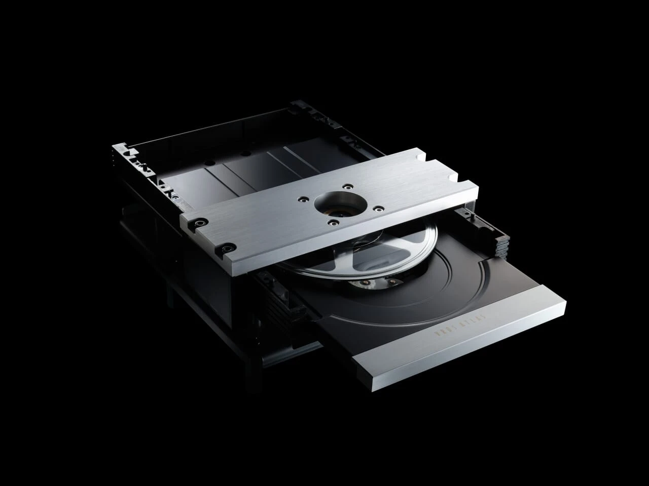 The core of the ATLAS 05 transport mechanism is a hybrid turntable made of high-precision aluminum and polycarbonate materials. This beautiful design, inspired by a master tape reel and its superior vibration control capability, embodies the identity of Esoteric. Polycarbonate, the same material as the disc, contributes to natural sound quality with little coloration, and the hybridization with spoke-shaped aluminum effectively disperses vibration modes associated with high-speed rotation โ successfully minimizing rotation noise and rotation inertia. The bridge section supporting the turntable is larger and wider than that of the prior VRDS-NEO, and is made of a machined aluminum block 10mm thick with a beautiful hairline finish. Its high rigidity and heavyweight construction effectively eliminate vibrations that affect sound quality.