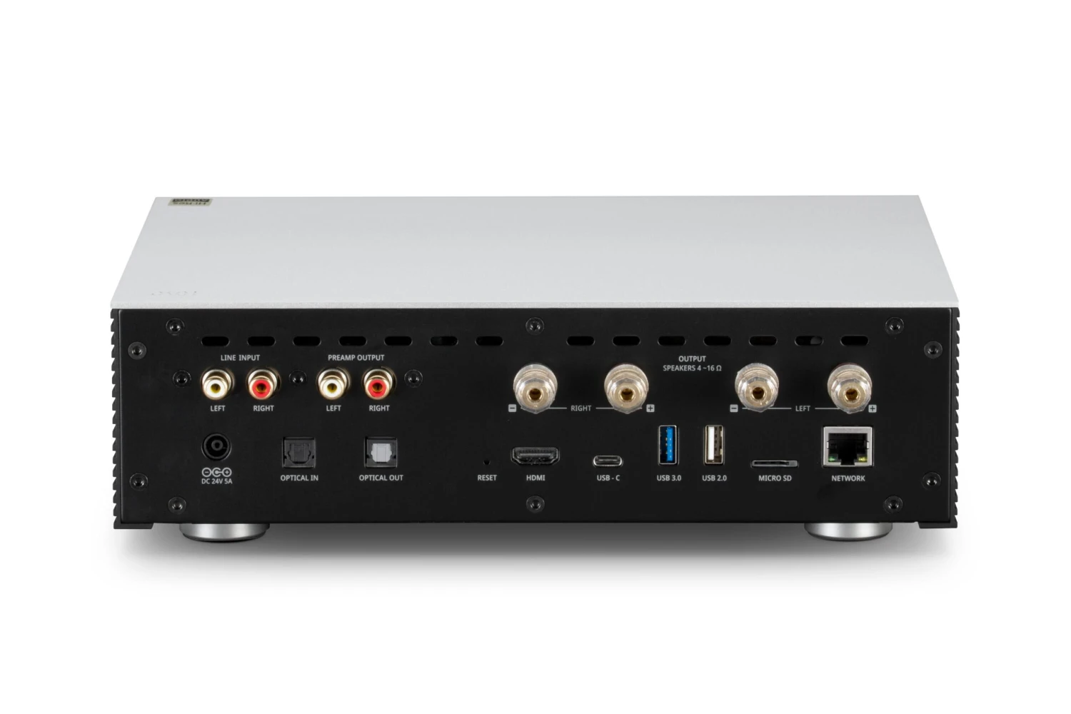 Outputting 50Wpc and equipped with Bluetooth, WiFi, and Ethernet connectivity, RS201E plays with the engaging fidelity that has made HiFi Rose an audiophile leader. Piloted by a customized Android operating system and fueled by a 32-bit/384kHz ESS SABRE ES9018 K2M DAC, RS201E decodes DSD256 and MQA while offering support and organization for TIDAL, Spotify, Quboz, internet radio, and more. Apple AirPlay and DNA are covered, too.ย