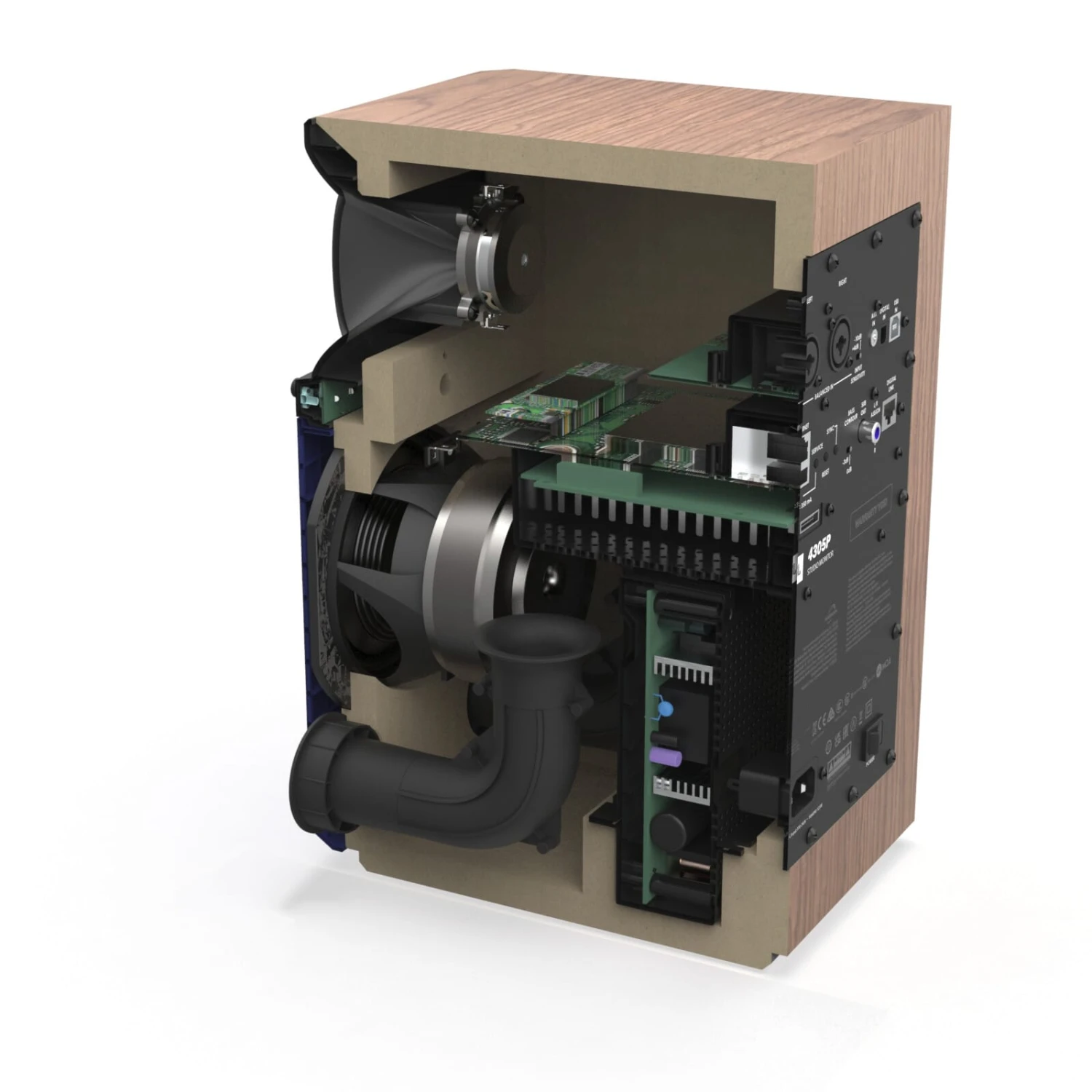 Inside, a 2410H-2 1-inch compression driver is mated to a High-Definition Imaging horn for crystal-clear highs and lifelike sonic dynamics. A 5.25-inch cast frame, fiber-composite cone woofer operates in a bass-reflex configuration with dual front-firing tuned ports to deliver room-filling bass. Each of the transducers is powered by an internal Class D amplifier delivering 25 watts to each compression driver and 125 watts to each woofer for a total system power of 300 watts. Custom tuning allows for a level of refinement and accuracy from the 4305P that is simply not possible with a passive loudspeaker. As the foundation for good sound, the enclosure of the 4305P is constructed from 3⁄4-inch MDF with internal bracing and features a real wood veneer finish.