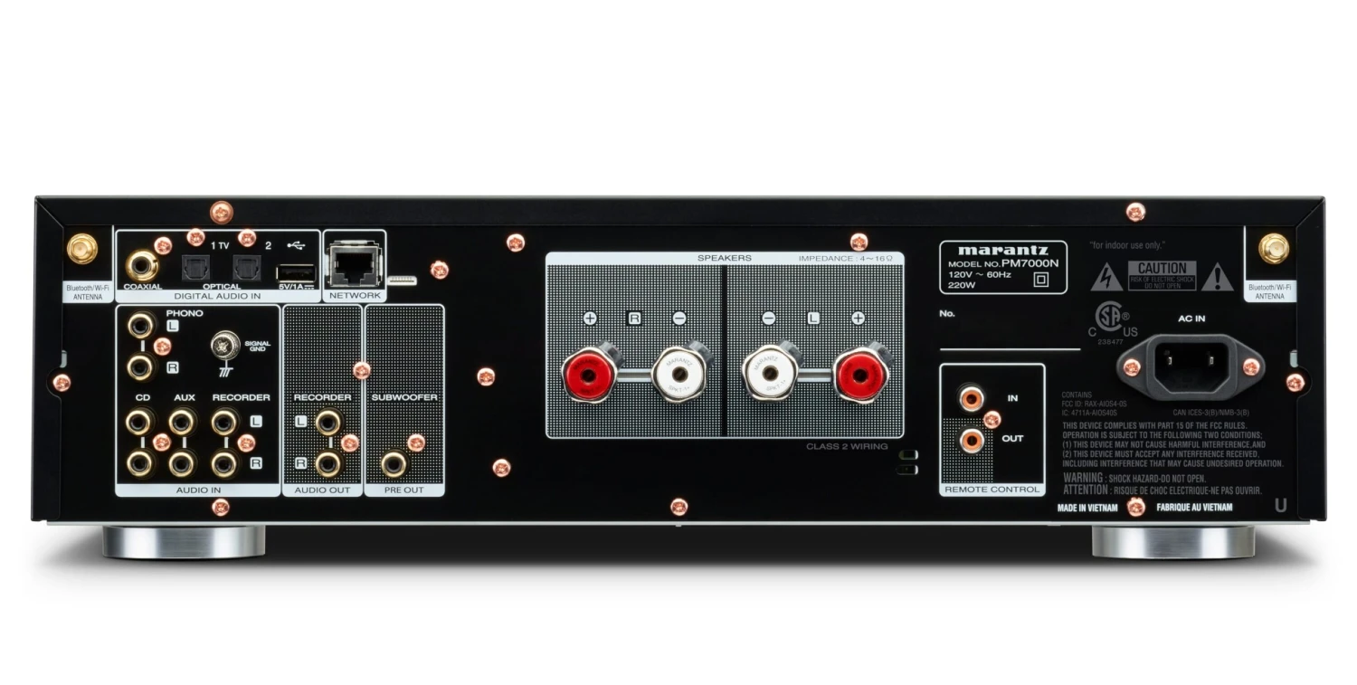 The 24-pound PM7000N is equally committed to modern flexibility. A wide array of connections – four analog inputs, one analog output, one coaxial input, two optical inputs, and a USB-A input for high-resolution files – supplement an integrated phono preamplifier with a FET input stage, built-in Bluetooth and Wi-Fi, and a dedicated subwoofer output. Of course, onboard HEOS means you can build a whole-home system around PM7000N and listen to TIDAL, Spotify, Pandora, Internet radio, and more in any room you want.