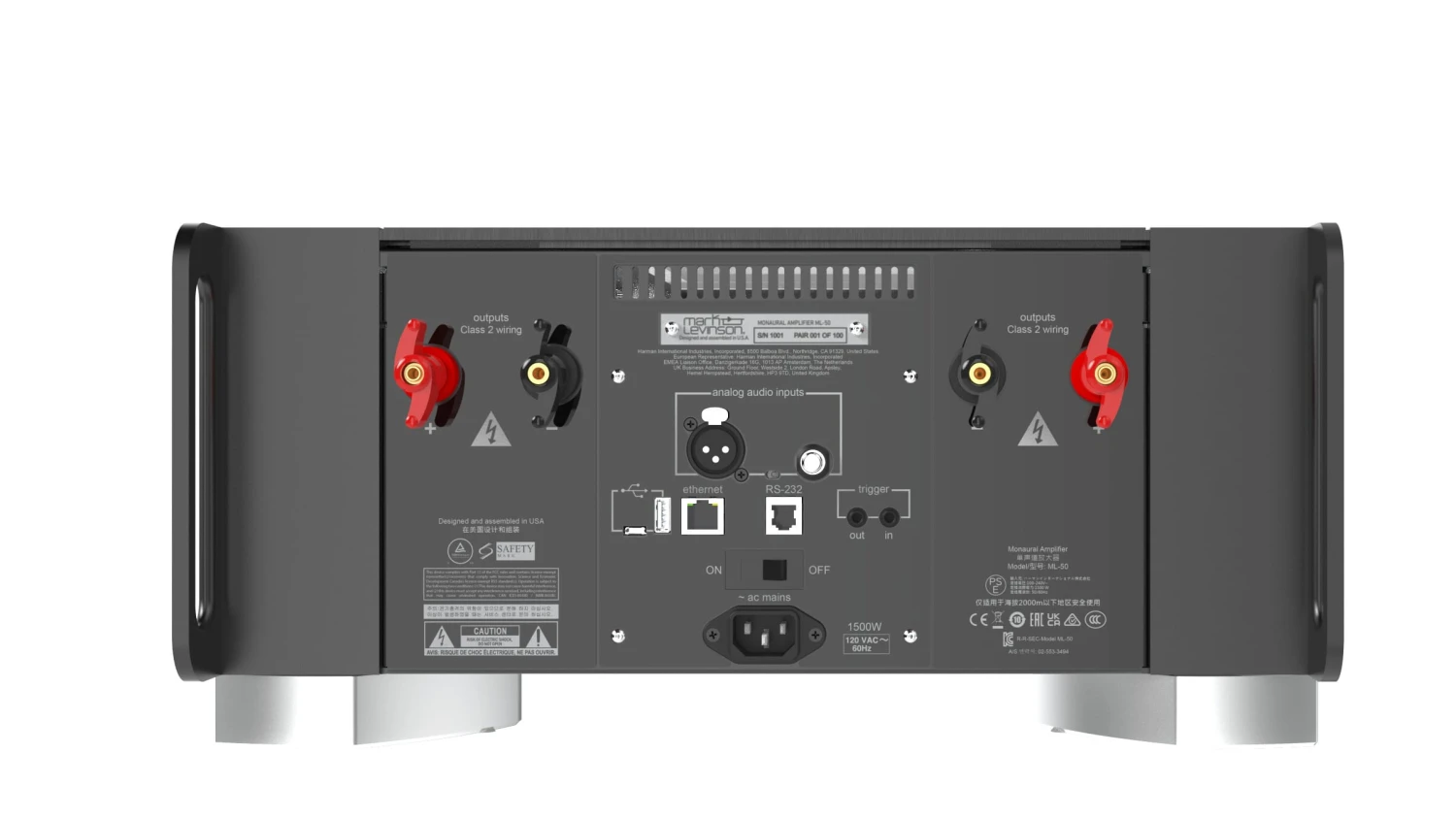The clean rear panel of each ML-50 has one fully balanced XLR input and one unbalanced RCA input for compatibility with virtually any preamplifier. Two pairs of the company’s “Hurricane” binding posts, two 3.5mm mono mini-plug trigger connectors, an Ethernet port, RS-232 connector, and USB-A port speak to its controllability. Minuscule total harmonic distortion ratios, 26dB voltage gain, and a more than 85dB signal-to-noise ratio underline its reference-grade measured specs. Dazzling casework and vibration-damping, mechanically isolated support feet reinforce the pride in which ML-50 was built — and how well-equipped it is to do its job.