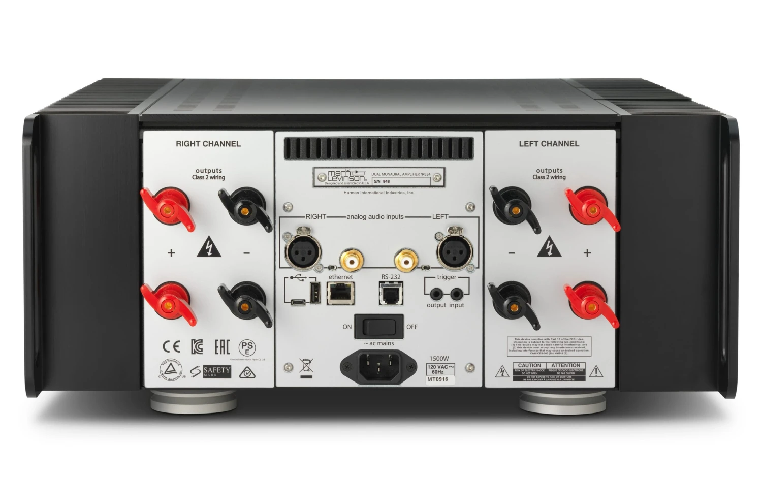 № 534 offers balanced and single-ended inputs for use with virtually any preamplifier or source player with variable output. For connection to loudspeakers, № 534 features four pairs of gold-plated binding posts with Mark Levinson Hurricane terminal knobs to support either standard or bi-wired loudspeaker connections. Speaker cables terminating in banana plugs can be used in the USA and other non-European countries. System-integration connectivity includes Ethernet/IP control, RS-232, USB for monitoring and configuration via web page, plus 12V triggers.