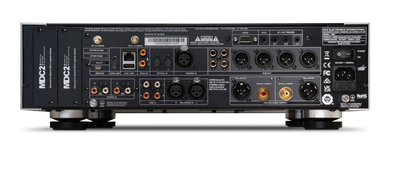 Such versatility extends to Ethernet and Wi-Fi networking, and an array of inputs and outputs that will satisfy even users with big, complex systems. How’s this for versatility: Two optical and two coaxial S/PDIF inputs; one AES/EBU balanced digital input; two pairs of RCA line-level analog inputs, one pair of XLR balanced inputs; and four balanced and four unbalanced subwoofer outputs complement an HDMI port with eARC support for your TV. What about vinyl LPs? Covered, via an audiophile-grade MM/MC phonostage with RIAA equalization, high overload margins, and an infrasonic filter. Got headphones? Hook ‘em up to the M66’s dedicated headphone amplifier, complete with low-output impedance and high-output voltage capability.