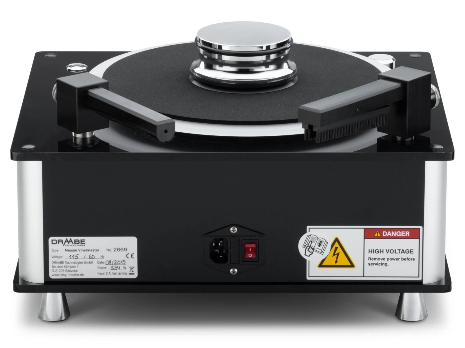 And let’s not overlook aesthetics. While many record-cleaning machines seem utilitarian or even homely in appearance, Nessie Vinylmaster touts aesthetics that exemplify pride, beauty, and coolness. A raven-black, 8mm-thick, high-gloss acrylic case abets a satin acrylic “snow” turntable mechanism, both of which are complemented by elegant chrome and stainless-steel elements. To protect your LP labels from any moisture, a hard, chrome-plated aluminum clamp sports a rubber lip seal for extra assurance. Another distinguishing feature of Nessie Vinylmaster pertains to the inclusion of an anti-static mat for your records. Nessie Vinylmaster also comes with 500ml of Vinylin solution, a microfiber cloth, funnel, and tool to change the brushes.