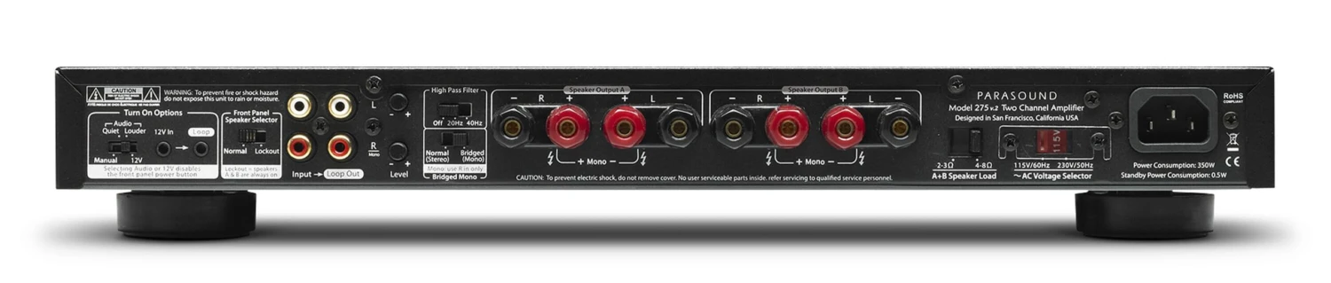 You might not think a 2.5-inch-tall power amplifier can pack much of a punch, but the Parasound NewClassic 275 v.2 is not your ordinary high-end component. Ideal for rooms and environments that need cool-running operation and high efficiency, the 20-pound mighty mite outputs a clean, conservatively rated 90Wpc into eight ohms – and 200Wpc in bridged mode. Providing 30 amps of peak current per channel, NewClassic 275 v.2 offers two-ohm stable operation with a load selector switch. In addition to its space-conscious 2.5 x 17.25 x 16 inch (HWD) chassis, it boasts the audiophile technology and engineering for which Parasound is renowned.