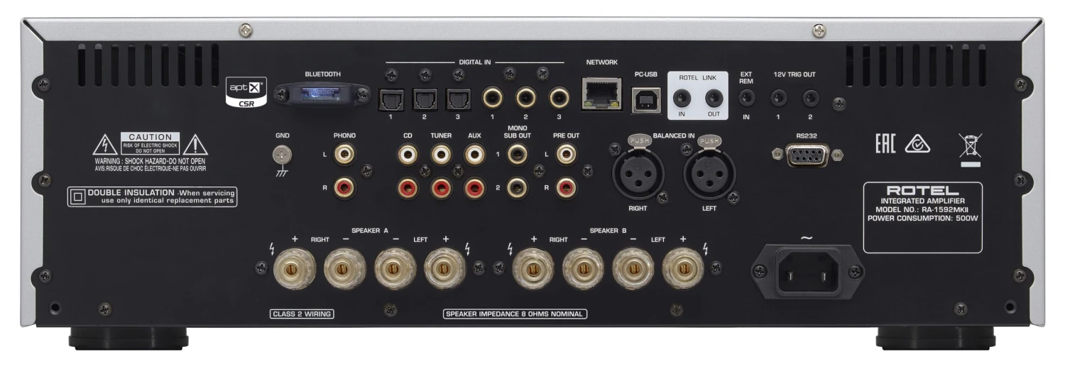The Rotel RA-1592MKII integrated amplifier is the perfect solution for audiophiles who want to listen to music in any format. The RA-1592MKII delivers 200 watts of Class AB output into 8 ohms, and diversity is the name of the game for this integrated amp, as it supports analog, digital, XLR, aptX and AAC Bluetooth, and PC-USB with MQA, plus a Moving Magnet phono stage. The audiophile-grade, 32-bit/384kHz DAC and precisely tuned circuits deliver an unprecedented sound stage with exacting positioning.