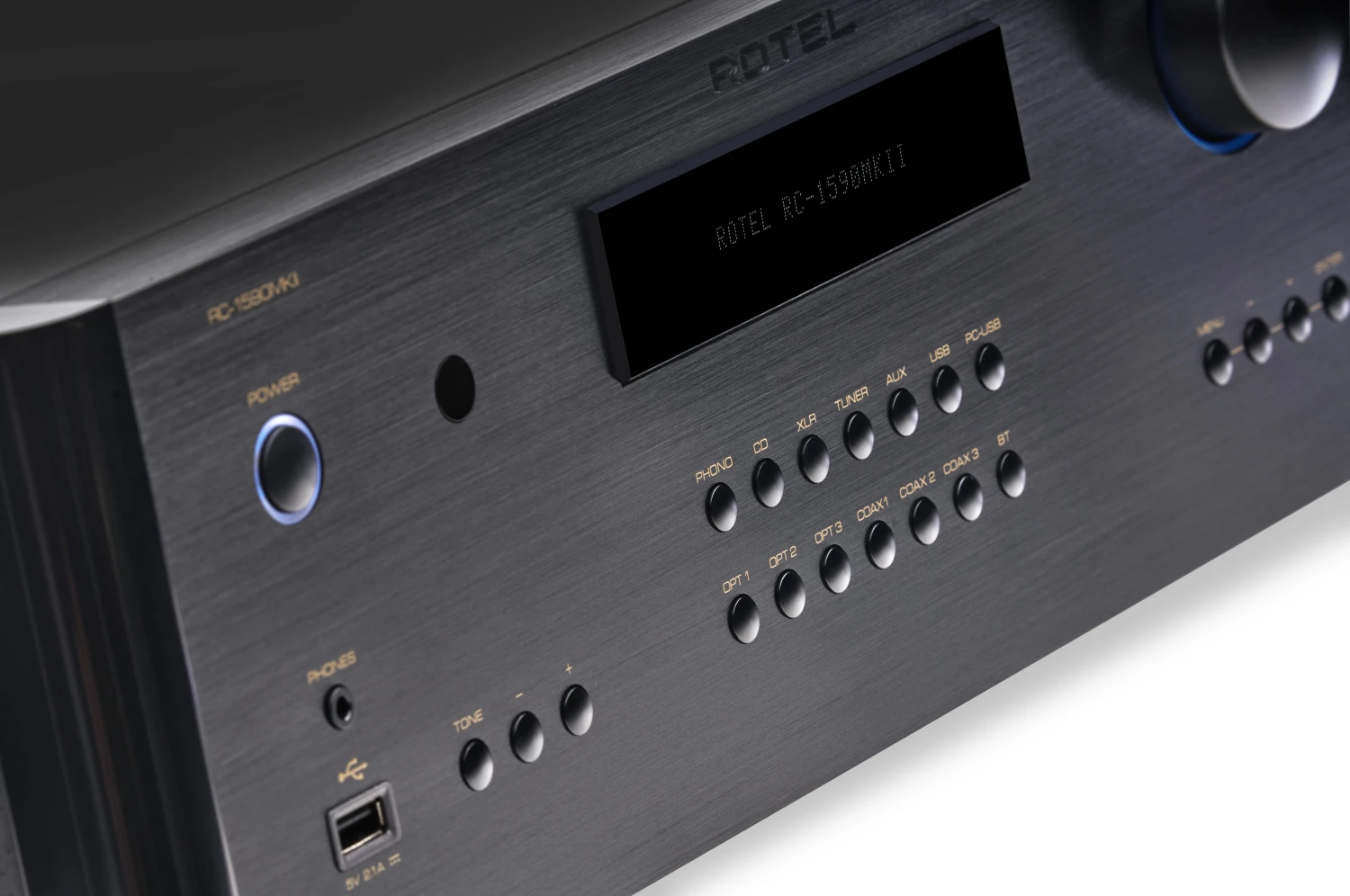 The elegant front panel of the RC-1590MKII includes more than a dozen easy-access source controls, a large, precision volume controller, a headphone connection, and a USB connection for iOS audio playback.