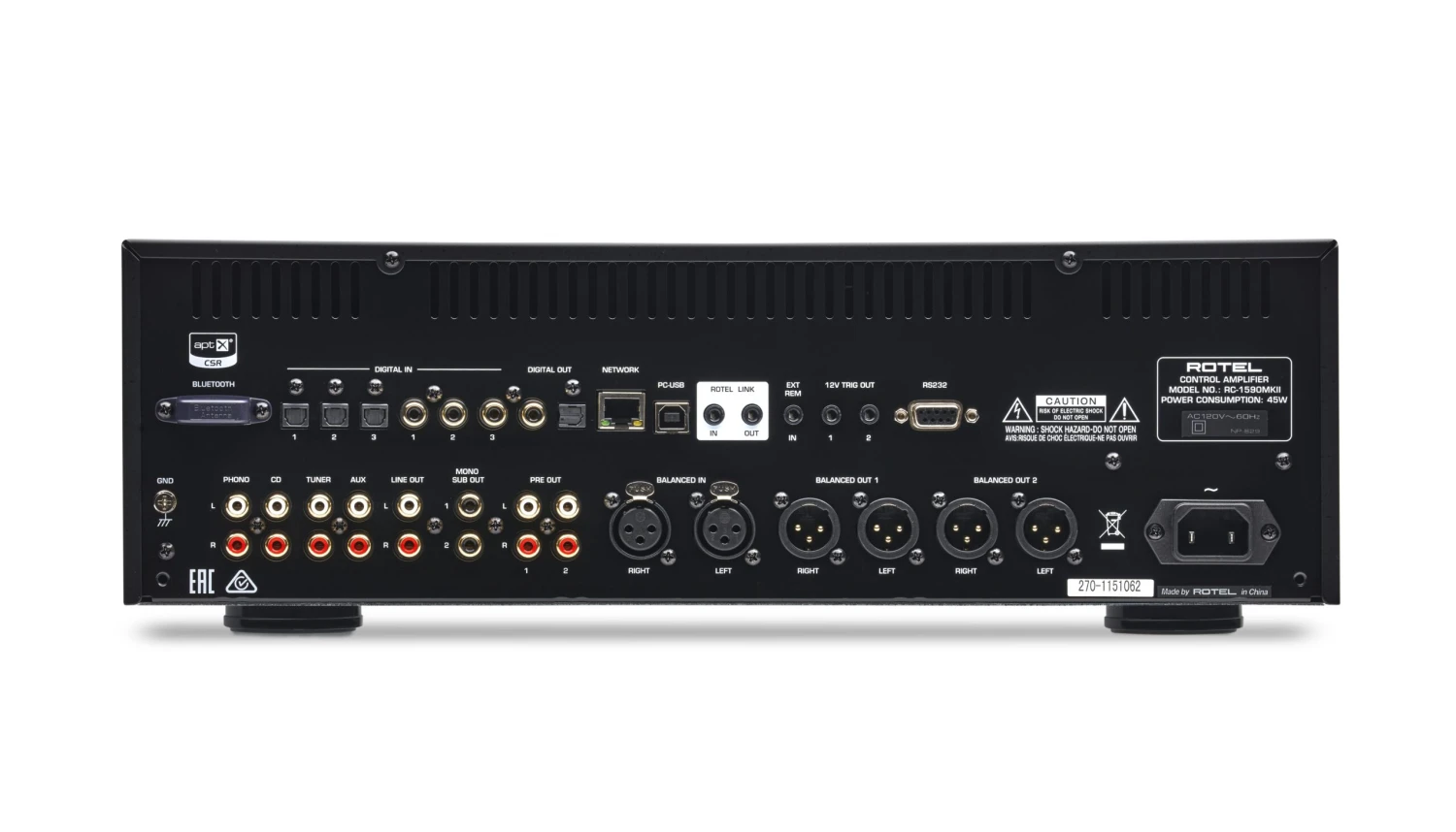 The RC-1590MKII supports a wide array of inputs, ensuring connection to your favorite sources, including a moving-magnet (MM) phono input for vinyl lovers. Other capabilities of this Roon Tested component include XLR balanced outputs, high-quality aptX and AAC Bluetooth for wireless streaming, plus PC-USB (32-bit/384kHz) supporting MQA decoding and rendering. Dual RCA and XLR output connections provide tremendous flexibility, including bi-amplification installations. Additionally, a subwoofer output is included.