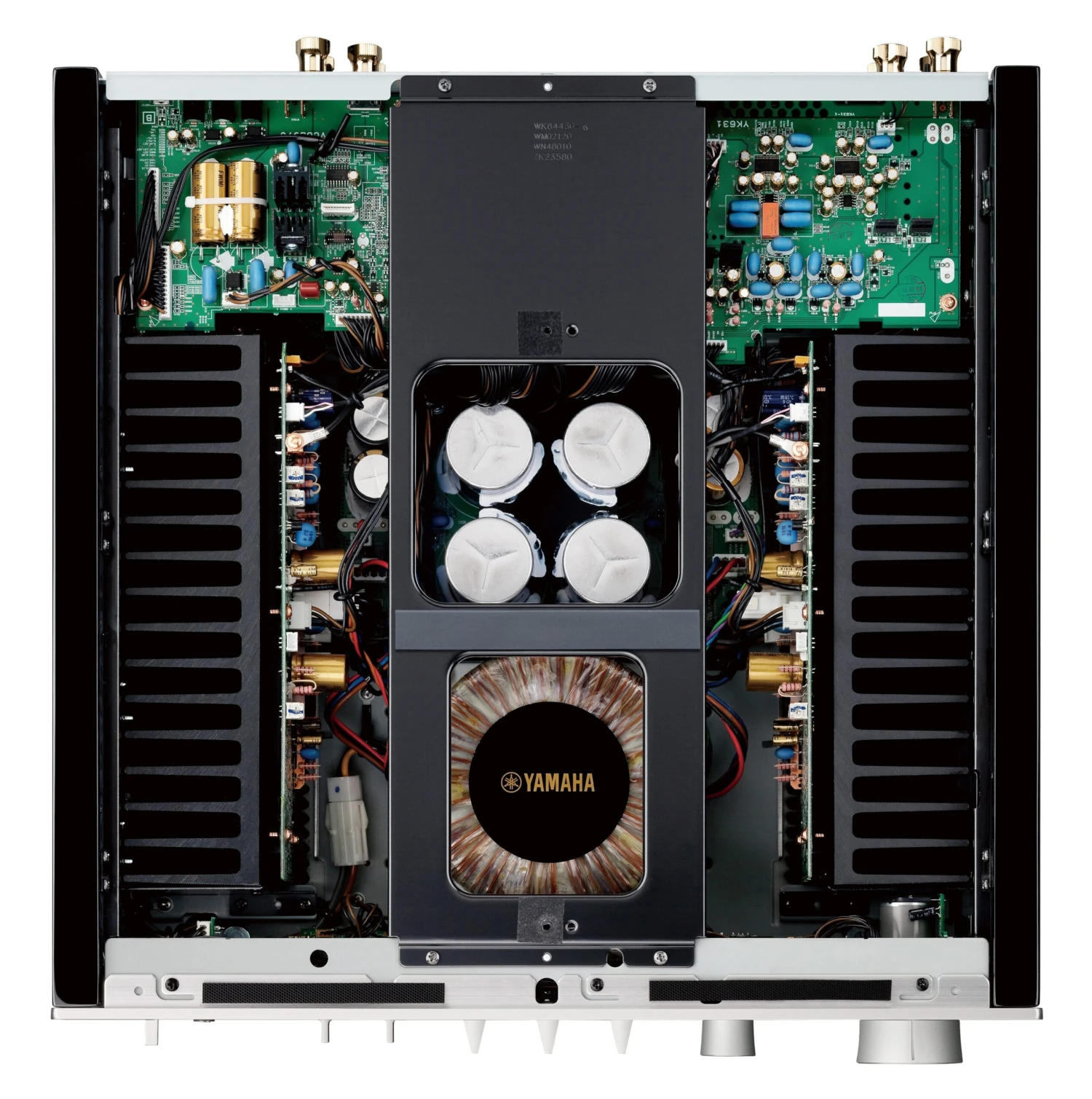 Yamaha’s Mechanical Ground Concept – in which the power transformer, four 18,000uF block capacitors, and large heat sinks are directly bolted to the chassis – and welded iron foot mounts also reflect how seriously A-S1200 takes its responsibilities. Ditto the machined brass speaker terminals, which accept banana, spade, and bare wire.