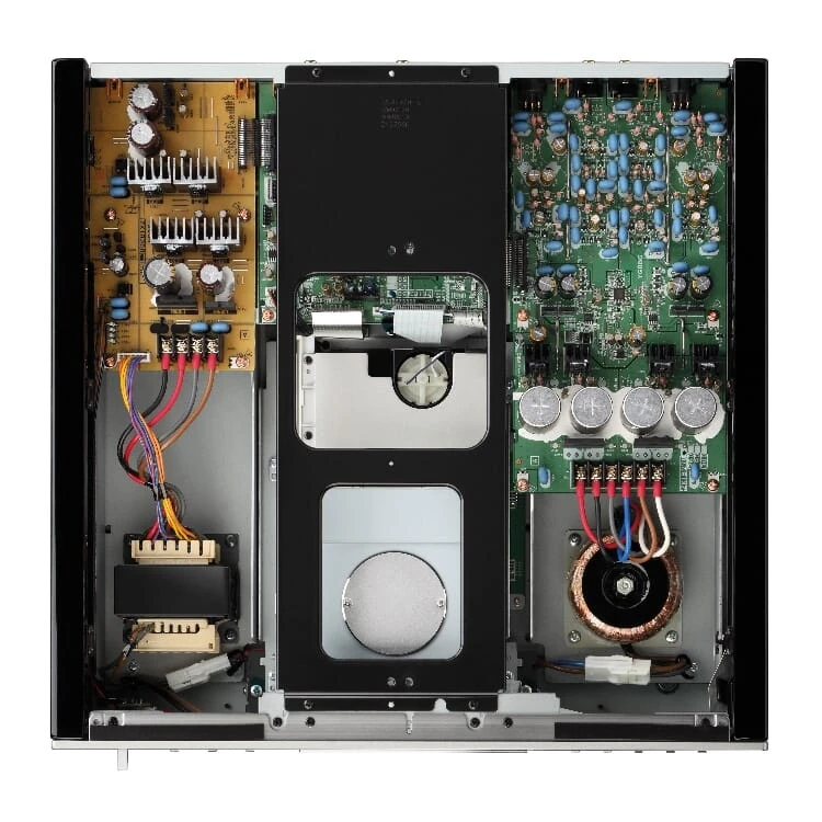 The CD-S2100 has completely symmetrical construction: the rotating loader mechanism is in the center, the digital power supply and circuit board are on the left side and the analog power supply and circuit board are on the right. Completely isolating the digital unit and the analog unit eliminates detrimental impacts of interference between the circuits while achieving ideal weight balance. The center frame that extends from the front to the back of the body, along with a front panel made of 1/4″ thick aluminum, increases rigidity of the entire chassis and ensures stable disc play.